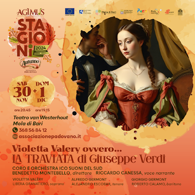 E ora va in scena anche in quella piccola bomboniera che è il Teatro van Westerhout di Mola di Bari, dove il demi-monde rappresentato nel titolo capolavoro di Giuseppe Verdi ispirato a «La signora delle camelie» di Alexandre Dumas, viene presentato per l’Agìmus in una versione da camera con le voci dei tre personaggi principali affidate a Libera Granatiero (Violettà Valéry), Aleandro Escobar (Alfredo Germont) e Roberto Calamo (Giorgio Germont), accompagnati dal Coro e Orchestra Ico Suoni del Sud diretti da Benedetto Montebello.